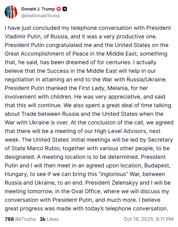 Görüşme sonrası Donald Trump, iki lider arasında konuşulanları kendi Truth Social hesabından paylaştı.