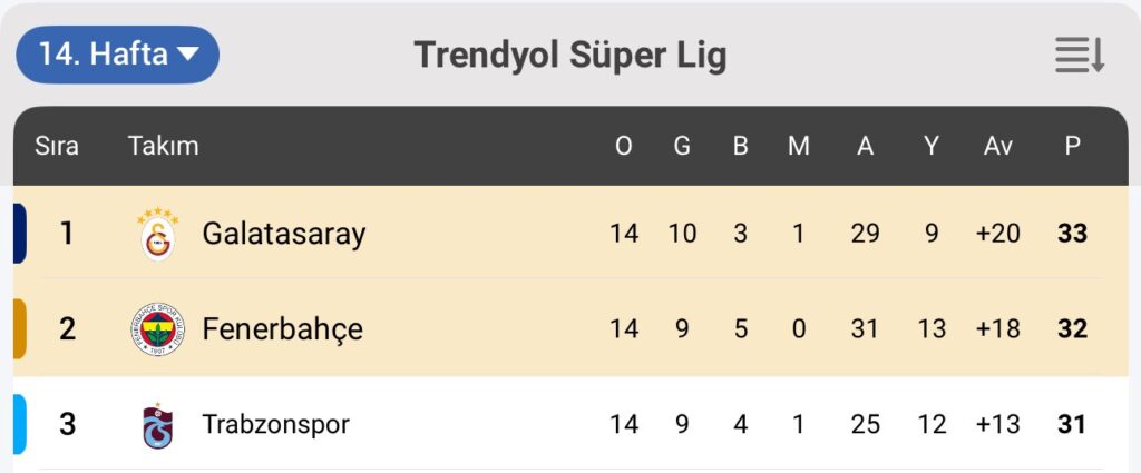 14. haftanın sonunda Galatasaray ve Fenerbahçe’nin puan kaybetmesi itibariyle Trabzonspor tekrardan yarışa dahil oldu!
